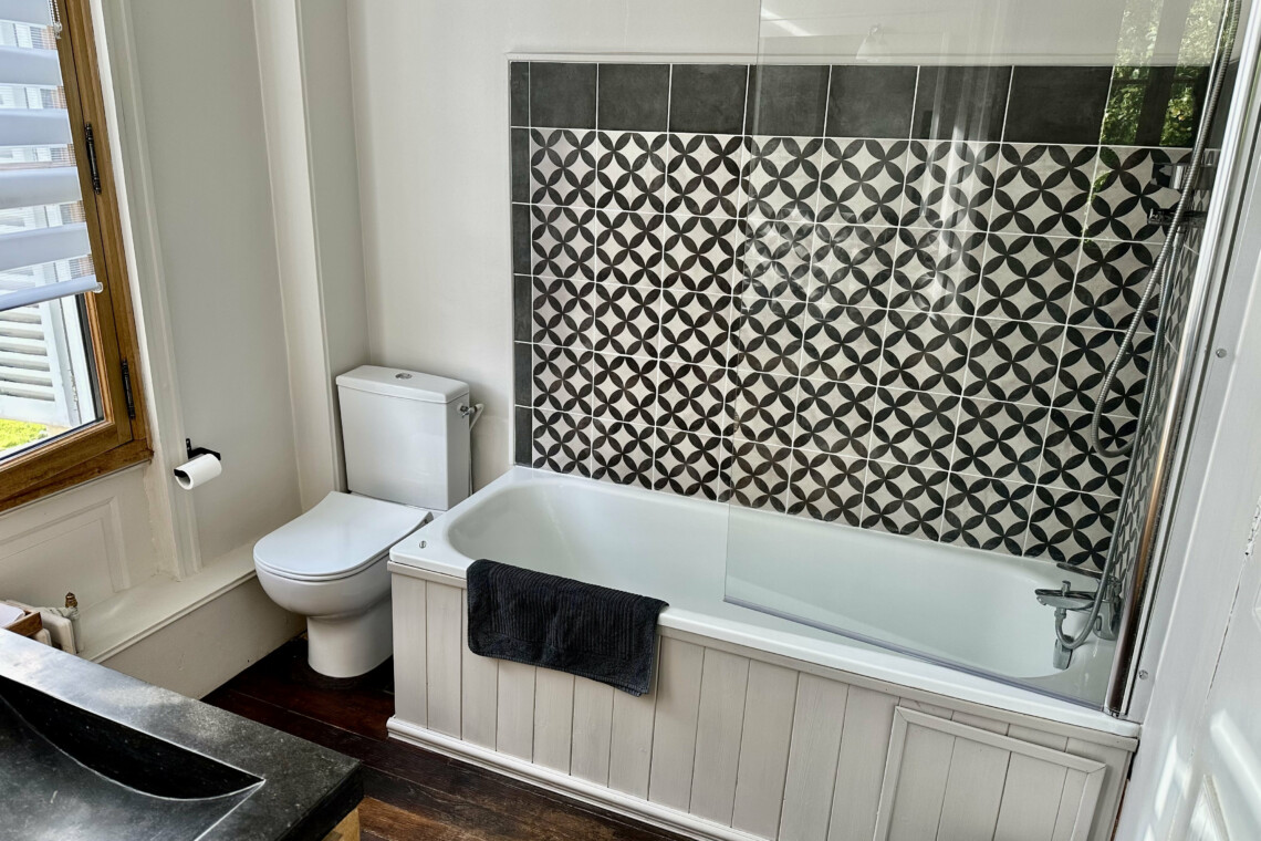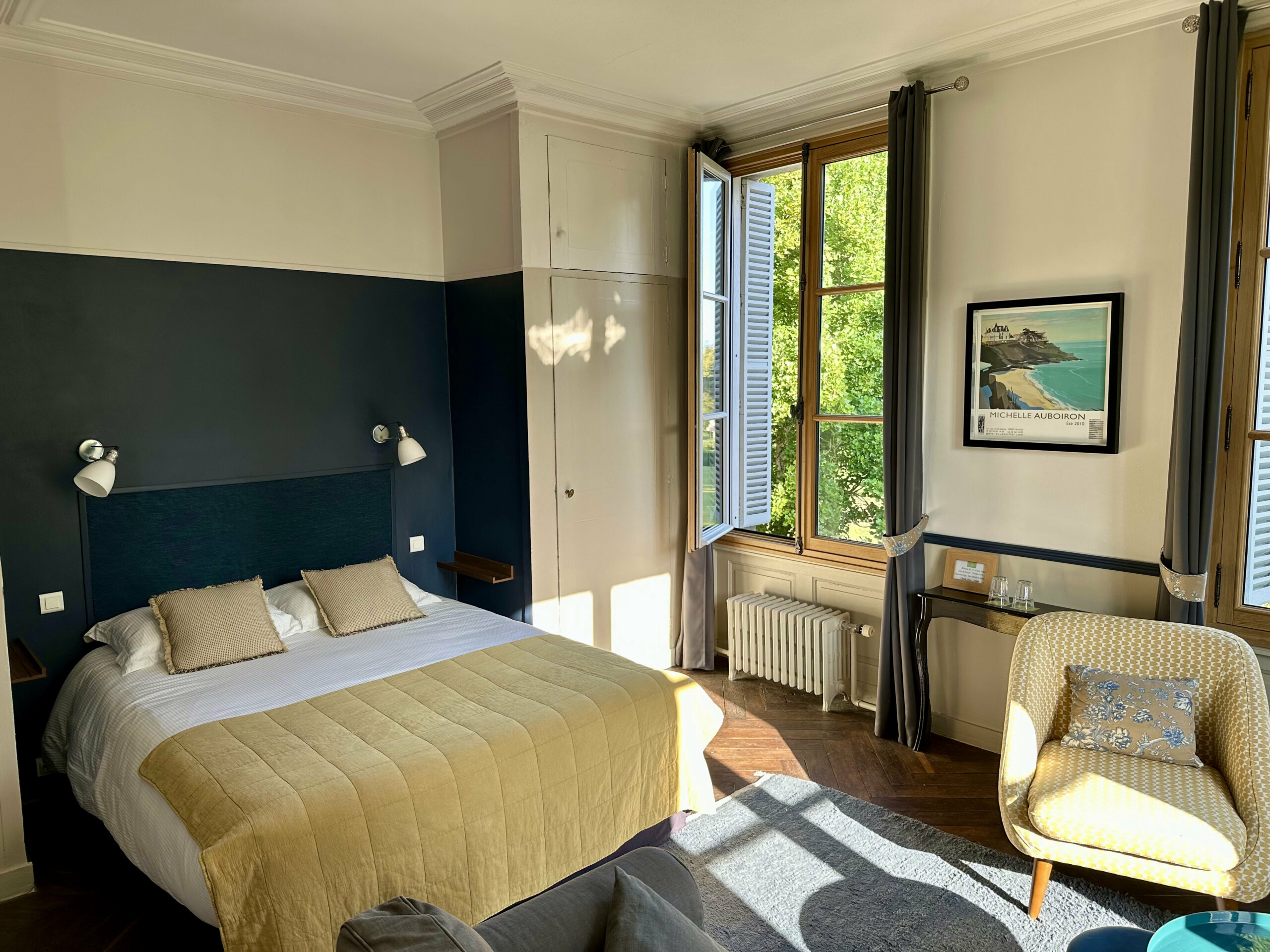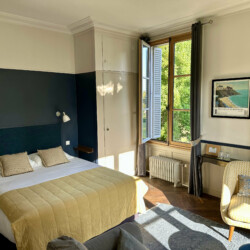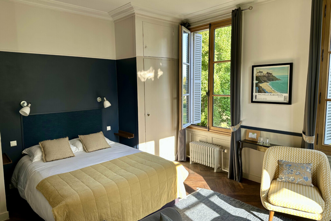 Suite aux dimensions confortables, avec une partie salon. Trois fenêtres donnant sur le parc. Le charme de l’ancien: cheminée en marbre, moulures, parquet d’époque. Salle de bain aux couleurs de chêne et de grès, disposant d’une baignoire confortable.