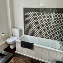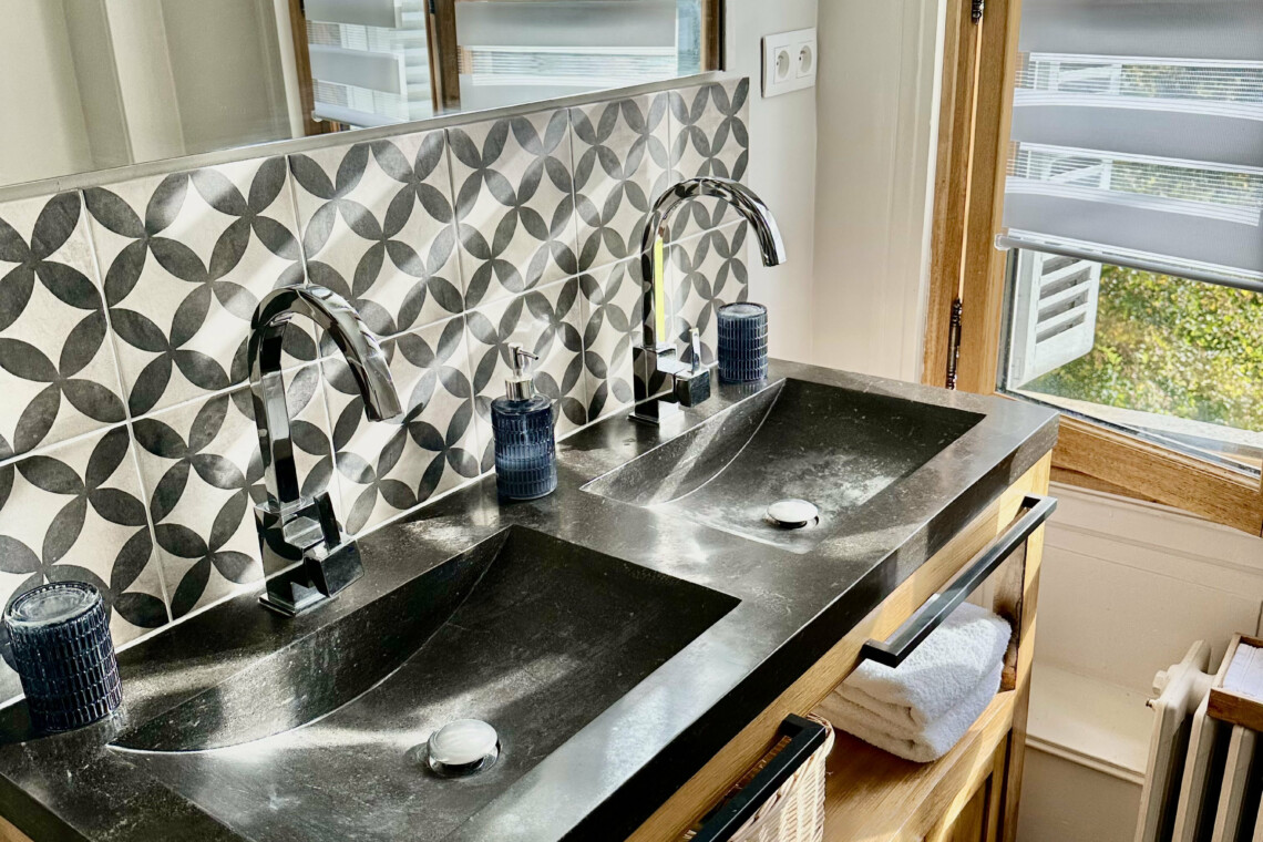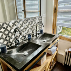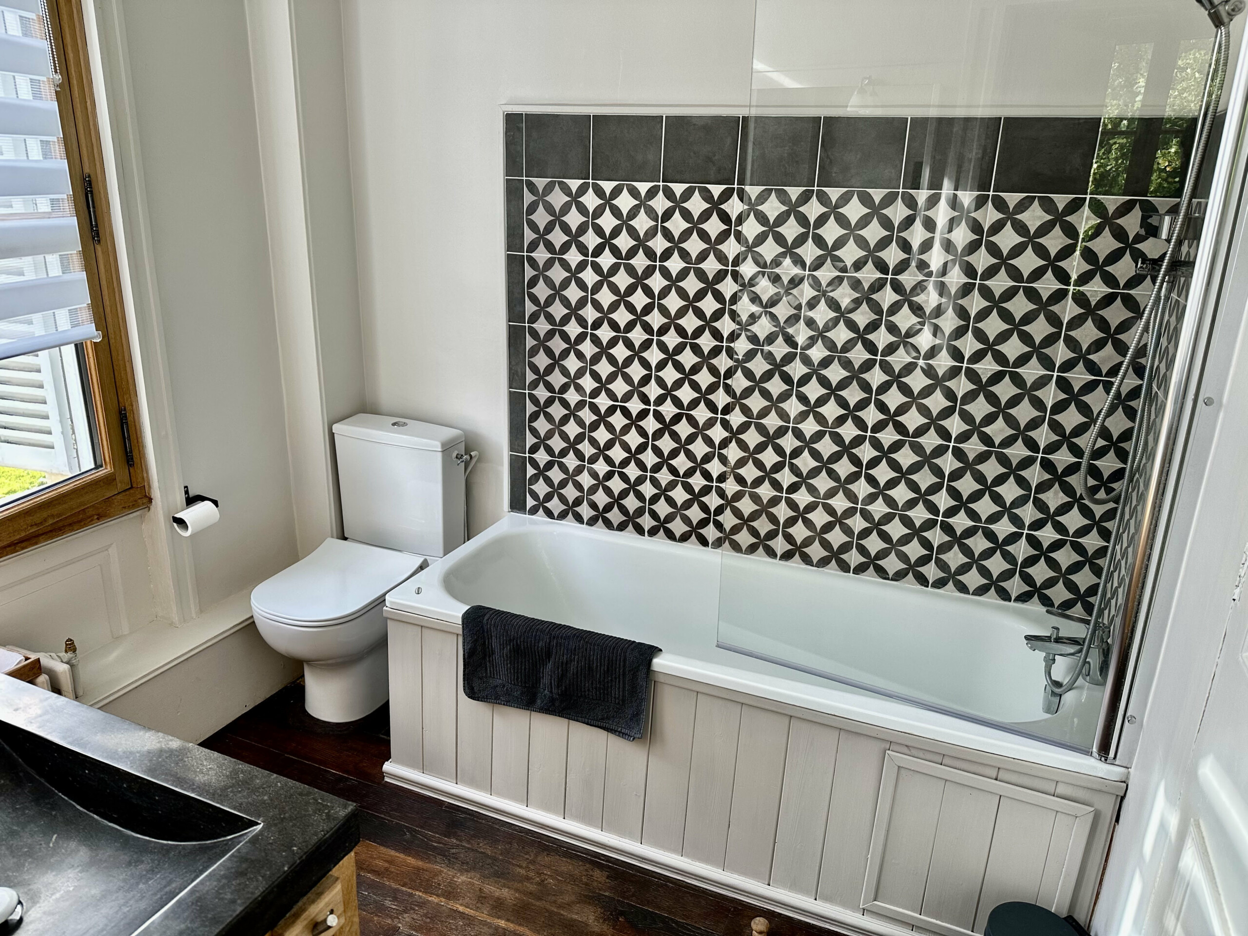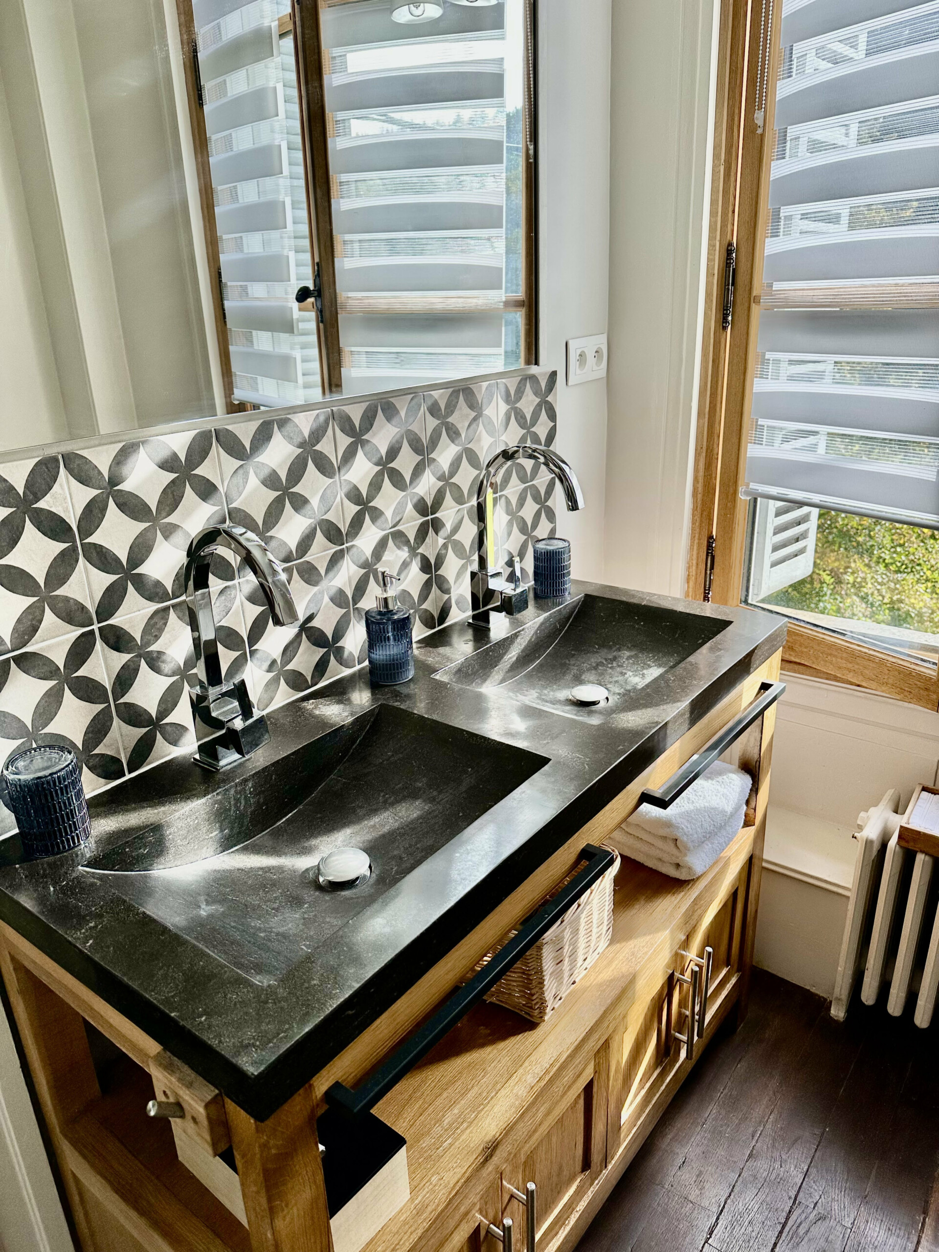 Suite aux dimensions confortables, avec une partie salon. Trois fenêtres donnant sur le parc. Le charme de l’ancien: cheminée en marbre, moulures, parquet d’époque. Salle de bain aux couleurs de chêne et de grès, disposant d’une baignoire confortable.